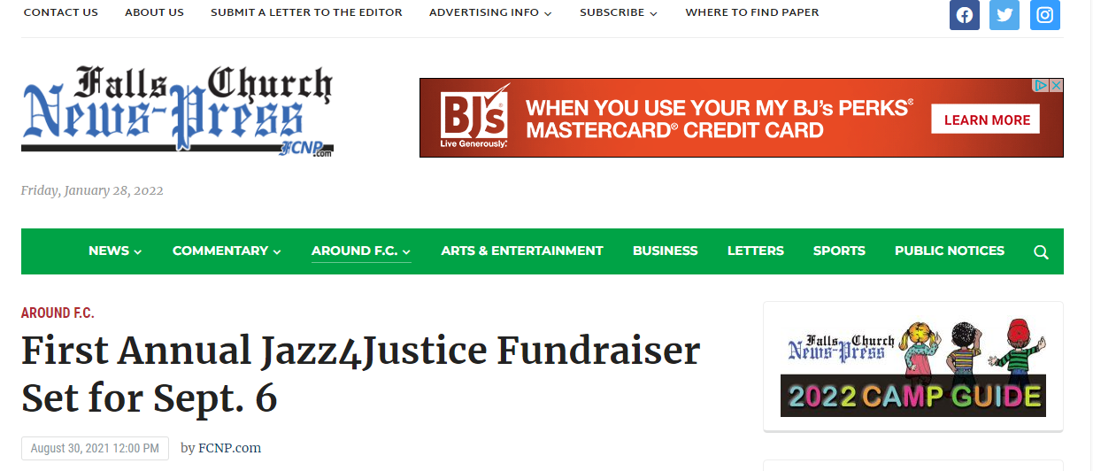 Many thanks to the Falls Church News Press for coverage of the 1st Annual Jazz4Justice at Mr. Brown’s Park in Falls Church, VA on Labor Day, 2021.